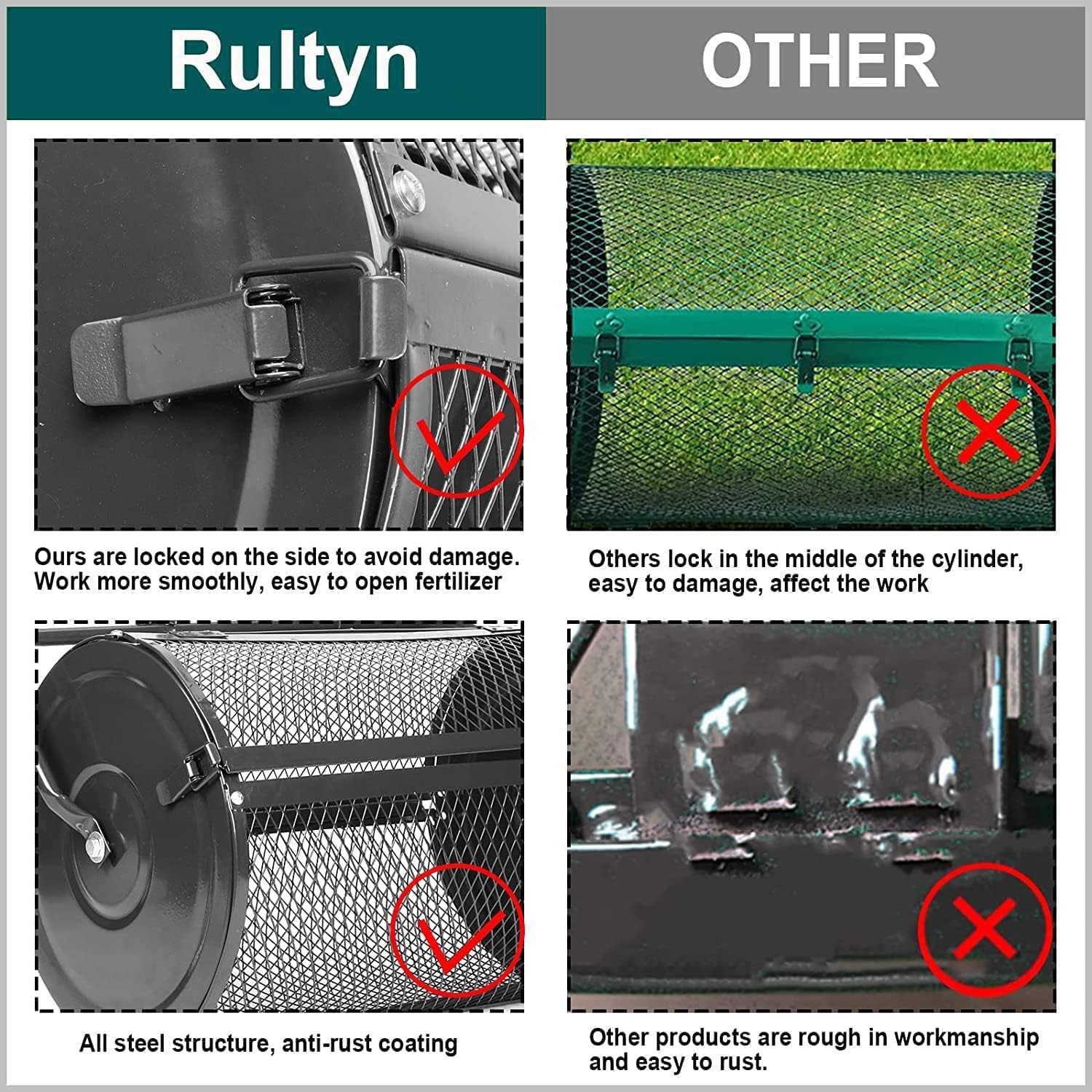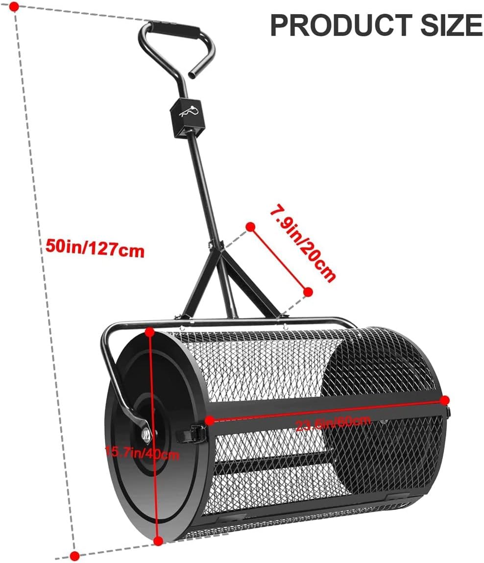 Let's walk towards our dream lawn together.Lawn and Garden Spreader makes fertilizing easier and saves you costs by allowing you to use less material to maintain your lawn! Trust lawn care and you will get a beautiful lawn.Durable QualityAll-iron construction and powder-coated finish make this peat moss spreader sturdy, rust-proof, and long-lasting. Besides, two locking clasps are firmly built to make sure it stays closed during rolling.Hinge Door to Open EasilyComplete the work without any hassle! The hinge door swing with double locking clamps opens for easy filling and stays closed during use.PVC Grip HandleThere are two grips on either end of the handle. With its and ergonomic design, this top dressing spreader is super labor-saving and makes the whole process more efficient.Specification:Material: Sturdy stainless steelColor: Black/GreenSpreader Size: 24" L x 12.5" HProduct weight: 8.3 kgPackage Contents:1 x Spreaders for lawns
