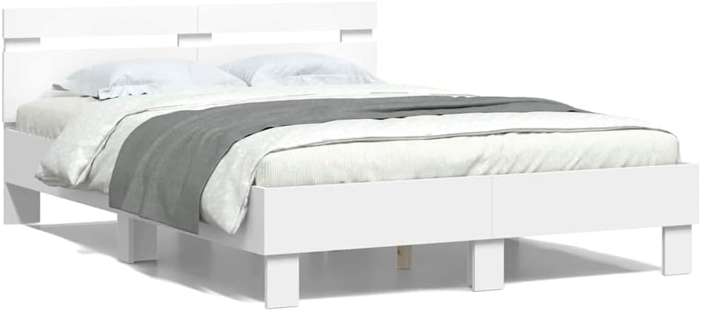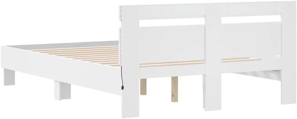 Engineered Wood Construction This bed frame is made from strong engineered wood, chosen for its durability and sleek look. This material is known for withstanding wear, ensuring the bed stays a beloved piece for years without losing its charm or strength.LED Lighting Options The cool multicolour LED strip lights bring adjustable lighting, enhancing the room's vibe. These lights can be easily managed with an in-line switch on the power cord, making it a user-friendly addition that adds a touch of modern tech to everyday life.Fixed Slatted Frame Built with a tough, non-flexible slatted base, this frame easily supports all kinds of mattresses, promoting comfort during sleep. Its design is budget-friendly, providing essential support that adds to the sturdy overall build.USB Powered The bed is equipped with a USB power source, allowing for smooth integration with modern tech, perfect for charging your devices in the bedroom without the hassle. This feature adds to its utility, marrying function with a stylish design.Care & Maintenance Keeping the bed looking fresh is a breeze with its wipe-clean surface. Just a damp cloth is enough to get rid of dust and keep the bed's sleek look intact, making cleaning super easy and ensuring it stays looking new for longer.Good to know:This bed frame features a slatted base design and includes the slats.Color: WhiteLights color: MulticolourFrame material: Engineered woodHeadboard material: Engineered woodOverall dimensions: 55.91 x 75.98 x 27.56 in (L x W x H)Compatible mattress size: Full (53.9 x 74.8 in)Lights type: LED strip lightsPower source: USBLights switch type: In lineDurableIndoor use onlyAssembly required: YesDelivery-contains:1 x Bed Frame