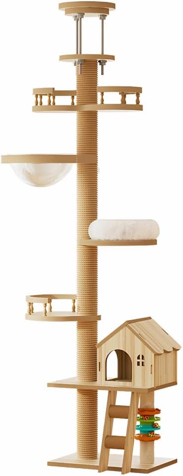 Ultimate Cat Playground: Our Floor to Ceiling Cat Tree is designed to provide your feline friends with endless entertainment and comfort. This spacious Cat Tower with Scratching Post allows your cats to climb, scratch, and lounge in style. Adjustable Height for Any Space: With an Adjustable Height of 98-110 Inches, this cat tree fits perfectly in any room, making it a versatile addition to your home. You can customize the height to suit your space while providing your pets with a safe and enjoyable environment. Cozy Condo Cave Bed: The Large Wood Condo Cave Bed offers a private retreat for your cats, allowing them to nap and relax in peace. The included Hammock provides an additional cozy spot for your cats to lounge, enhancing their overall comfort. Durable and Modern Design: Crafted from high-quality materials, our Modern Cat Activity Tree is built to last. Its stylish design not only complements your home decor but also stands up to the playful antics of your beloved pets. Encourages Healthy Scratching Habits: The integrated Scratching Post is essential for your cat's well-being, helping to maintain healthy claws and prevent furniture damage. This Floor to Ceiling Cat Tree promotes natural behaviors, ensuring your cats stay happy and engaged.