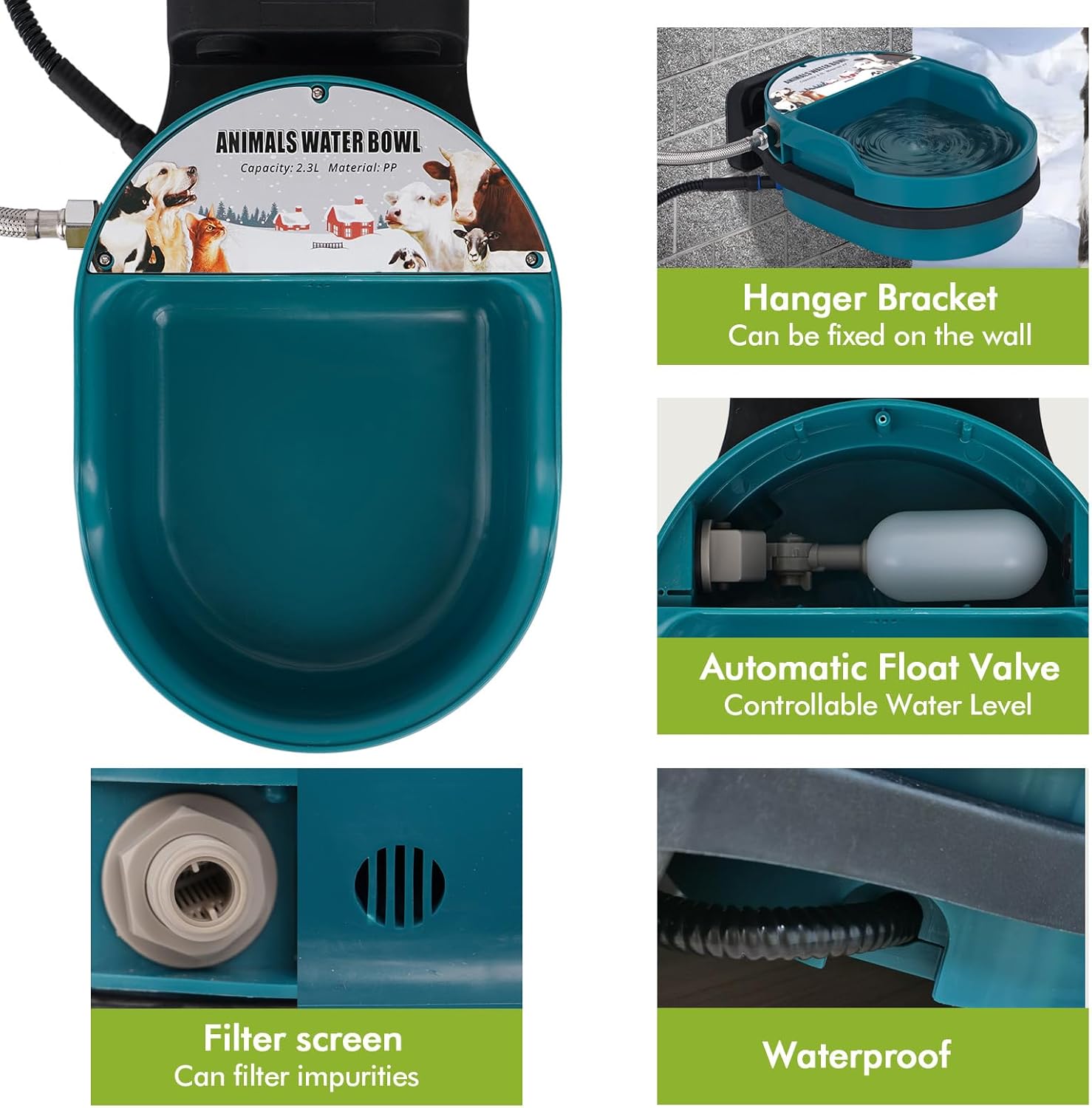 | Included Components | 1pc Brush, 1pc water pipe sealing tape, 2pc water pipe connections, 39.4“ Braided Hose, Automatic Water Bowl with Float Valve, Bracket |