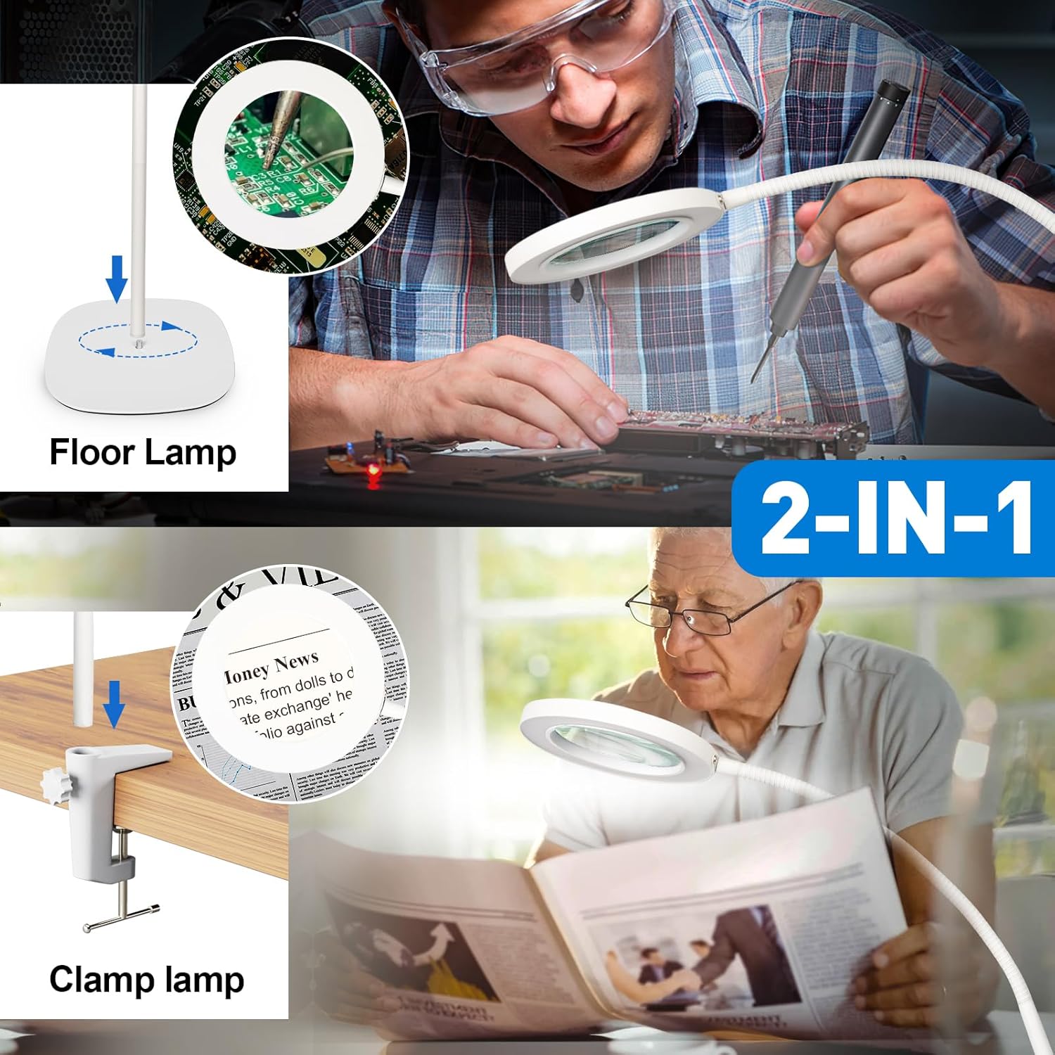 | Included Components | 1 * AC 5V/2A Adapter, 1* Cleaning Cloth, 1* Magnifying lamp, 1*Metal Clamp, 1* Large Floor Base |