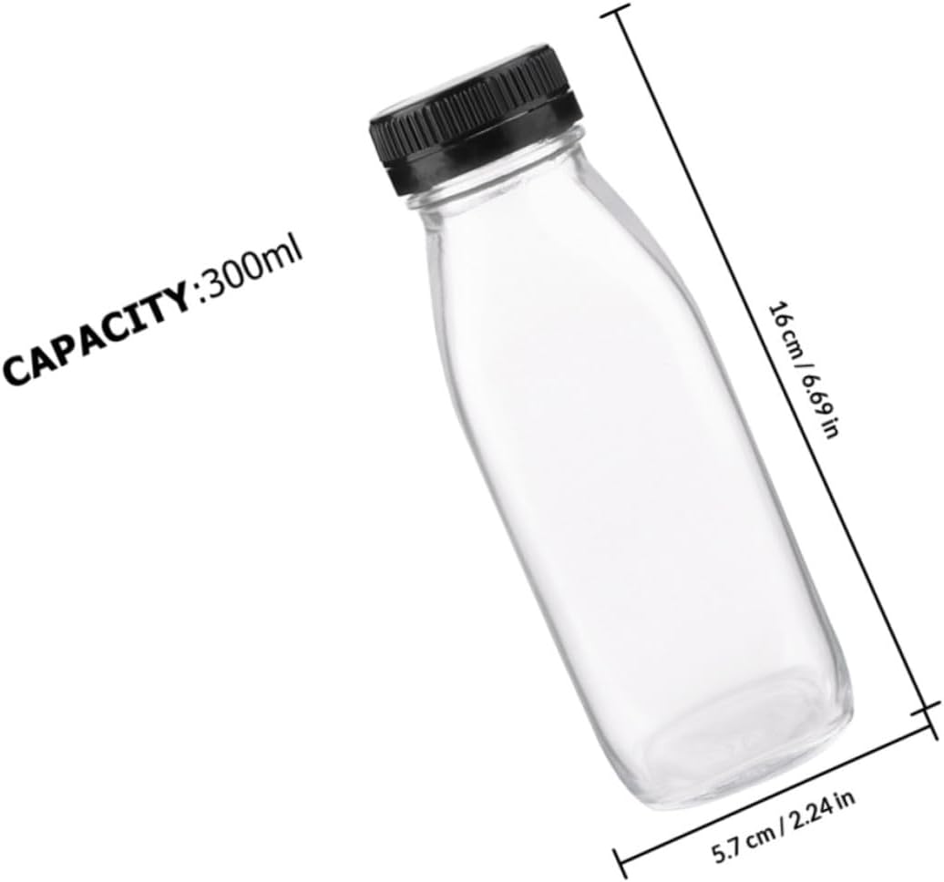Package List 6 x Juice Bottles Characteristics -Product Info:Glass drink bottle -Material:Glass -Note:Random color of the bottle lid -Capacity:300ml drinks bottles -Color:Transparent -Size:16.00X5.70X5.70cm/6.29X2.24X2.24in -Made by premium glass materials, which can be and safe for use. -The bottles can be wonderful choice for your friends, they will like it very much juice bottles with caps. -These bottles can be used to store drinks and juice. Use for parties or in classrooms drinks bottle. -With the flat-bottomed bottles design, the product can be placed on any flat surface clear bottles. -The sealing design will be protecting drink from leaking and dirty items, not worry to make disarray clear juice bottles.Goods Informationsmall juice bottles This multipurpose Drink Bottle is manufactured with premium glass materials, and practical enough to use.glass storage bottles The lid assures a tight sealing, suitable for storing liquid, and nice to use for drinks.glass juice bottles It can be used as container for milk, water, etc