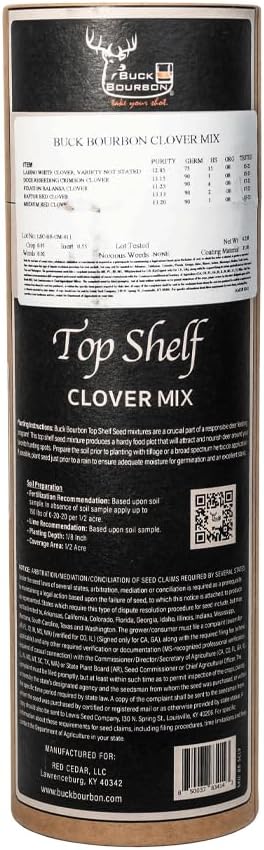 Buck Bourbon Top ShelfFood plot mixes were blended to grow big bucks. The Top Shelf Clover Mix is the perfect off season food plot to give your herd the nutrition when they want it most. The Top Shelf Clover Mix includes White Clover, Dixie Crimson Clover, Balansa Clover, Raptor Red Clover, and Medium Red Clover. Our Top shelf clover mix is easy to establish due to the mix of annual and perennial clovers. Top Shelf food plot seed mixes are great to plant anywhere you want that big buck to frequent. Grow bigger bucks and a healthier herd year round with Buck Bourbon Top Shelf Food plot seed. Feed Responsibly!