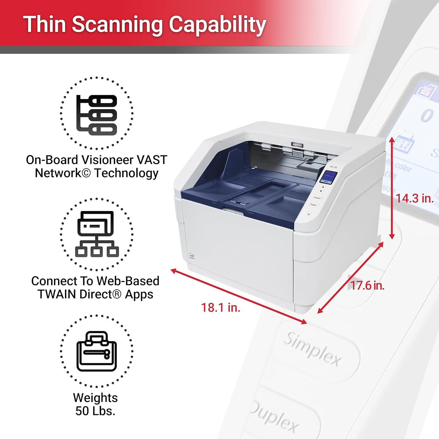 The Xerox W130 production scanner delivers leadership price-performance for high-volume document management scanning operations. Its 130 page per minute / 260 image per minute speed is supported with a 500-sheet input tray, reliable paper path, and 100,000 page daily duty cycle. An end-to-end hardware design including hardware image processing and USB 3.1 ensures scans at full speed. The high-resolution display supports up to 20 Visioneer OneTouch preset or custom scan workflows for easy walk-up operation. Includes Visioneer Intelligent Software Platform and ABBYY OCR software comprehensive software is included.