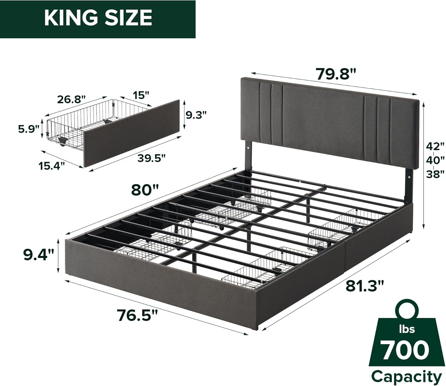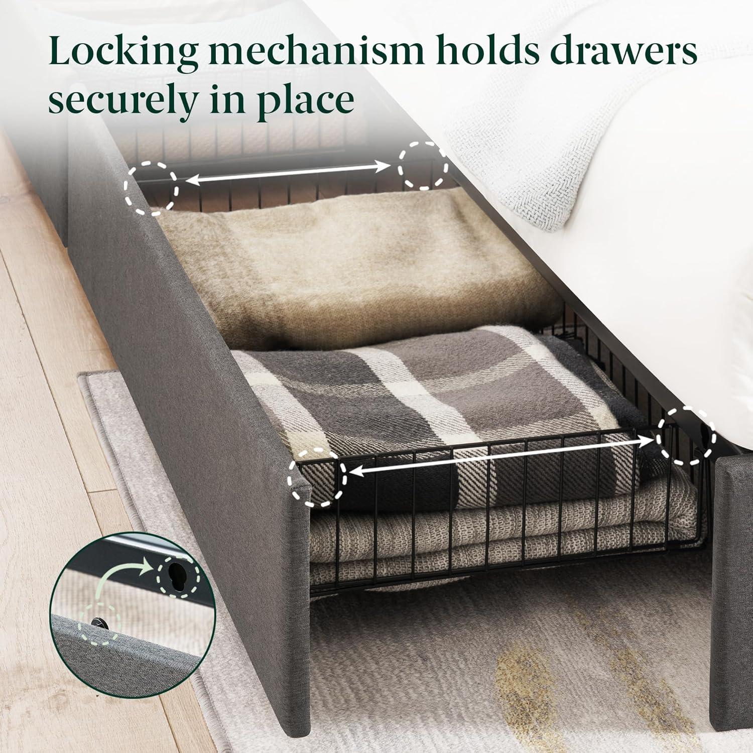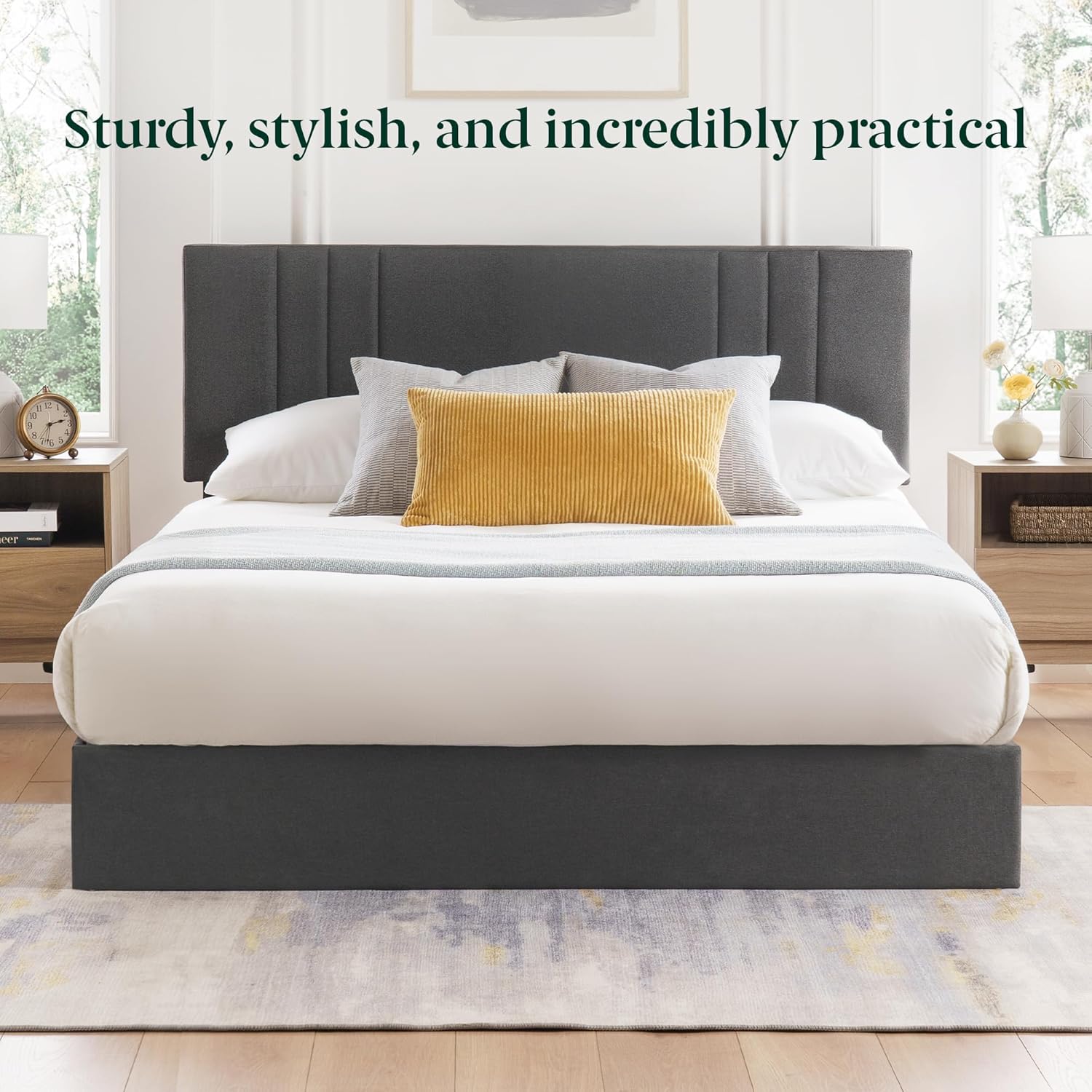 Space-saving, style-forward, and built to last—the Zinus Billie Platform Bed Frame delivers modern comfort in every detail. Its adjustable headboard offers three height options so you can tailor the look to your mattress and your room’s aesthetic. Covered in cushioned gray upholstery, the headboard adds a refined focal point while providing comfortable support for reading or unwinding. Four spacious underbed drawers give you ample storage without sacrificing style, making the Billie an effortless fit for primary bedrooms, guest rooms, or compact studio spaces. Crafted with a durable blend of steel, wood, and steel support slats, this bed frame is engineered for long-term reliability.