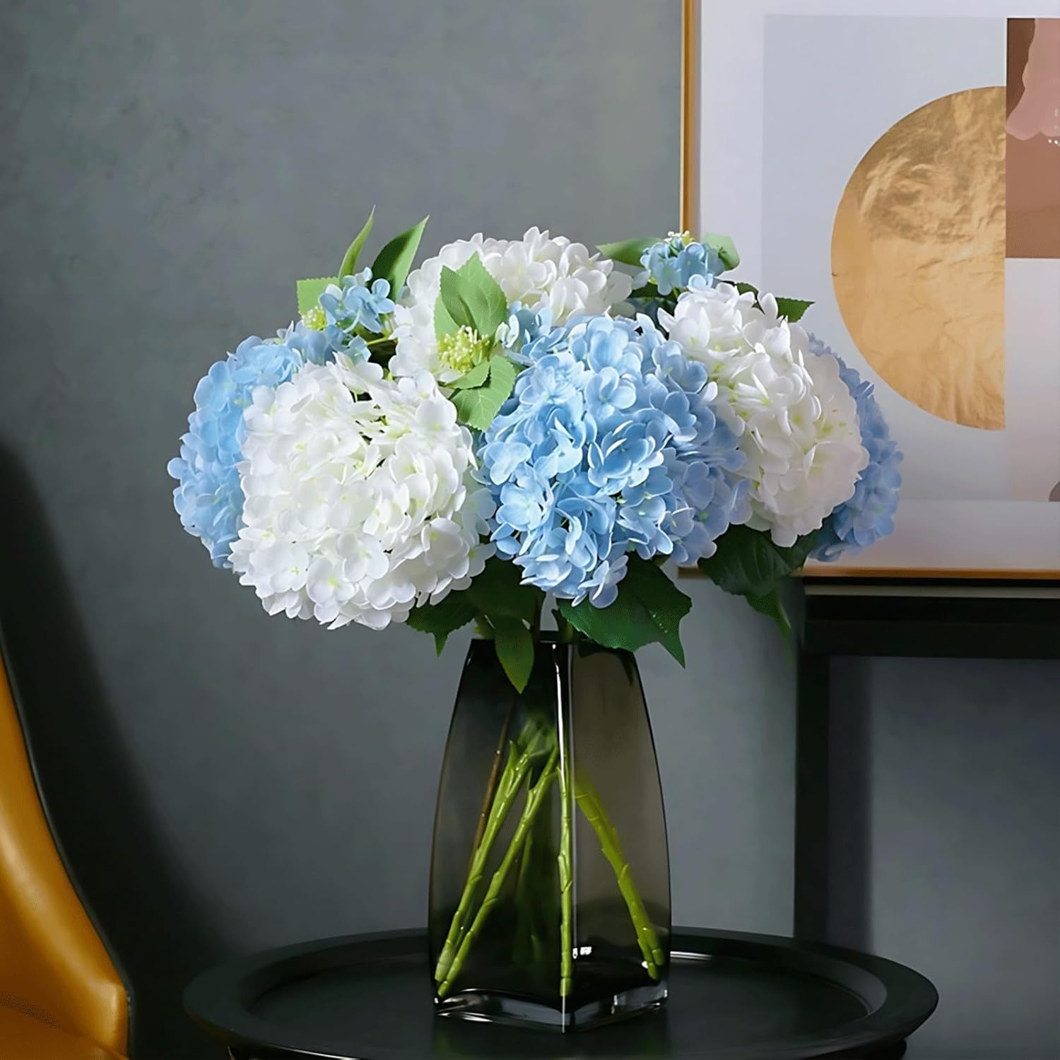 Artificial hydrangea rubber flower Material: high quality 3D printing latex + rubber rods + wire Size: total height: 22 inches/56cm, head diameter: 8.6 inches/22 cm Features: 1.The hydrangea petals are very soft and elastic. 2.The 3D texture of the petals is more realistic. 3.Spraying water will form water droplets on the petals. 4.It won't change color for a long time, you can enjoy it forever! Petals can condense water droplets The petals are very soft and have the same texture and touch as real flowers. Water droplets will be formed by spraying water, which can be placed outdoors to prevent fading. The petals can be cleaned if there is dust on them. Note: Vase is not included! Very realistic foliage With 3D printing technology, you can feel the same texture as real flowers by touching the petals and leaves Easy to bend or cut The bouquet is made of rubber tubing and wire, and the surface is made with a speckled texture, which is more realistic than regular hydrangeas. The wire is wrapped inside and can be bent freely. You can cut the length of the stem according to the height of the vase. Note: It is not recommended to clean the stems because a layer of textured glue has been created