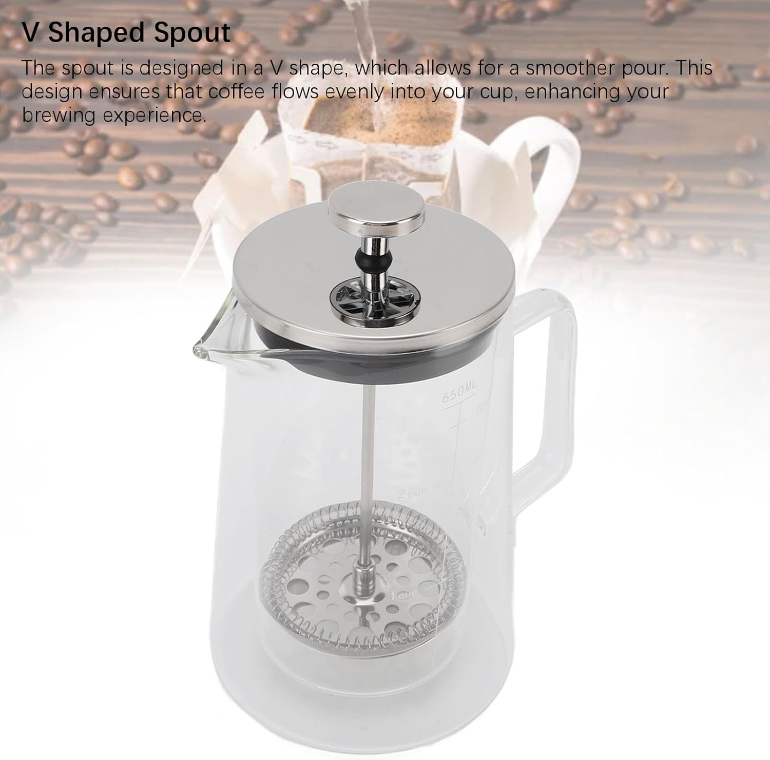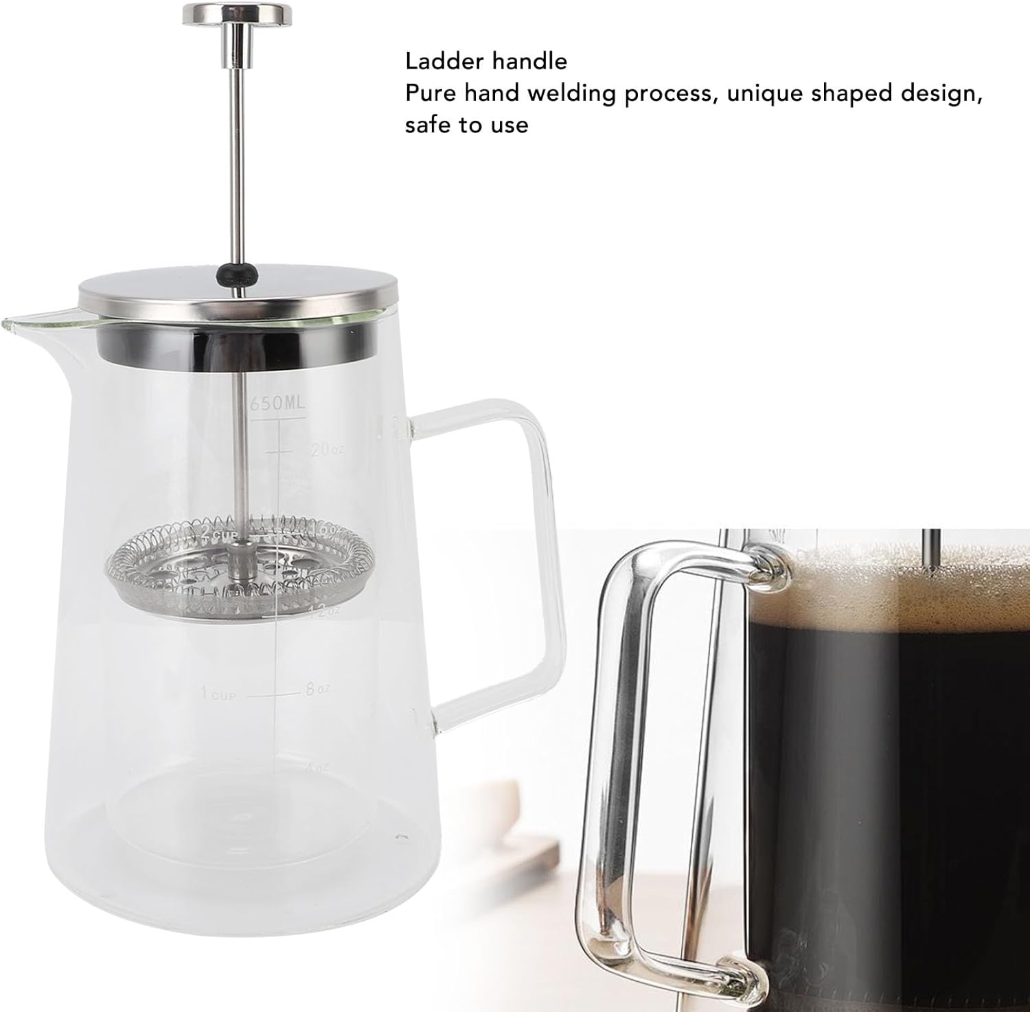 Item Type: French Press Coffee MakerMaterial: High Borosilicate Glass, 304 Stainless SteelWeight: Approx. 715g / 25.2ozOutside Diameter Caliber: 9cm / 3.5inBody Height (with lid): 19.8cm / 7.8inBottom Diameter: 12cm / 4.7inCapacity: 650MLWithstand Temperature Difference: -20℃ to 130℃Scope of Application: Recommended for Daily Use at Home, Studio, Clubhouse, Tea Room, etc.Package List:1 x French Press Coffee Maker